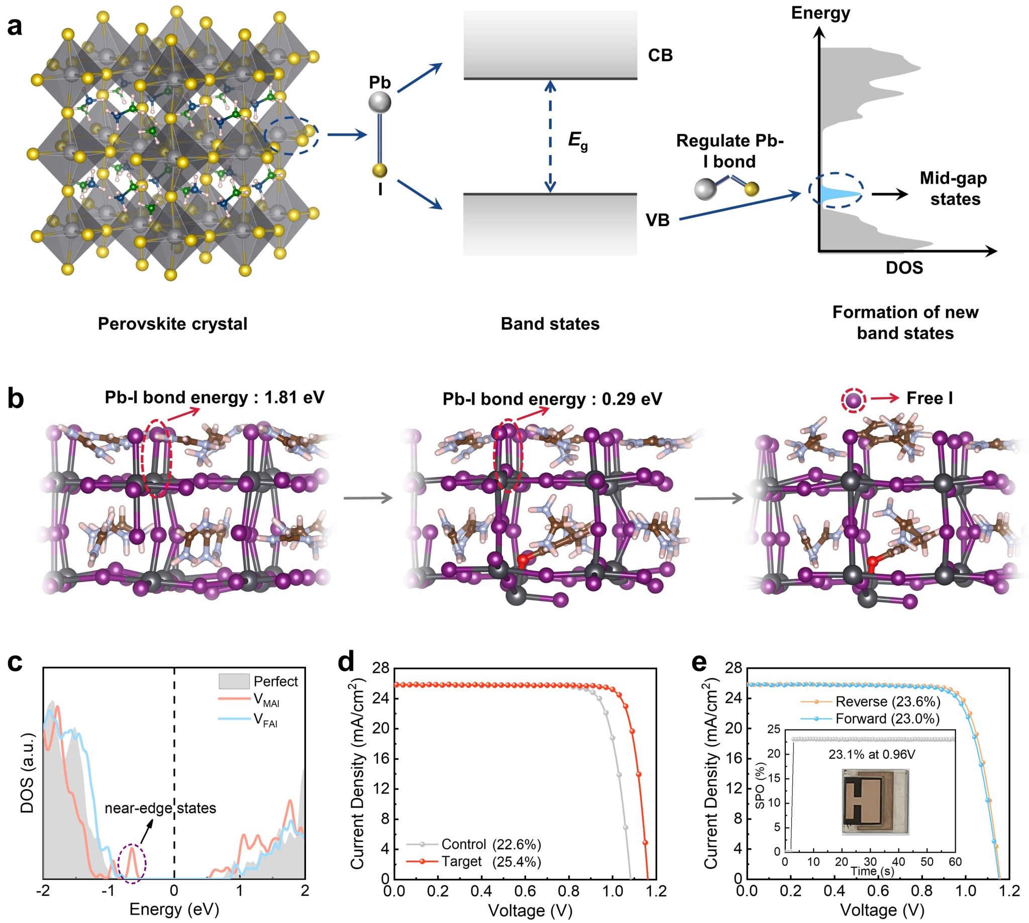 制备高效且稳定的钙钛矿太阳能电池对推动日后产业化进程尤为重要。王植平团队与合作者,从半导体能带结构设计出发,提出了一种能带工程构建超浅近边态的策略(如图a所示),通过特定的分子工程对钙钛矿半导体电子态的调控,实现了有效的掺杂。如图b所示,首先采用F-PEAI对钙钛矿进行体内掺杂处理,弱化表面Pb-I键能,再通过PEAI进行钙钛矿表面后处理,从而使表面I游离出来,改变能带结构并形成超浅近边态(如图c所示),实验结果发现近边态有效提高了载流子浓度和寿命,并抑制了钙钛矿的降解。如图d和e所示,基于此策略单节倒置钙钛矿太阳能电池效率得到了大幅提升,达到了25.4%(认证效率>25.0%),1 cm2的器件效率也达到了23.6%(认证效率为22.7%)。