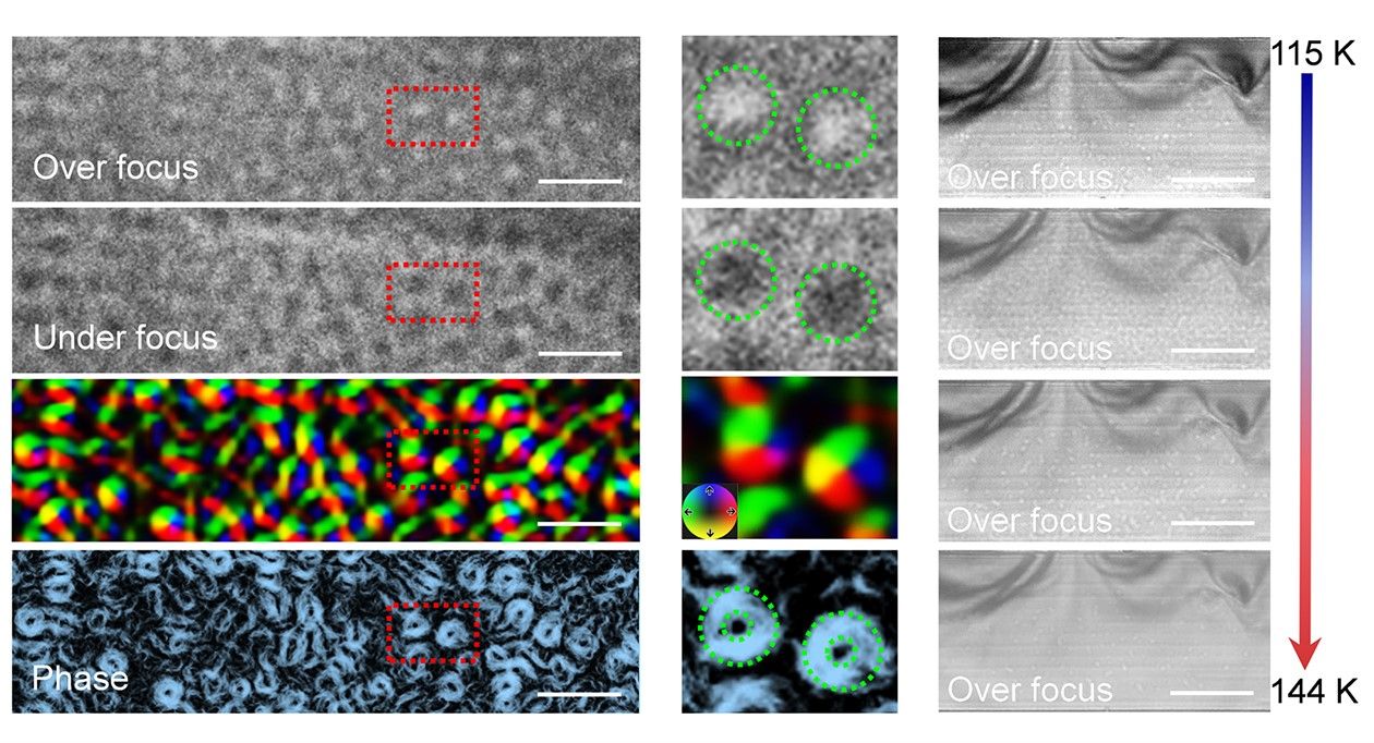 磁性斯格明子,即具有手性自旋的纳米磁畴结构,以其拓扑保护性、低驱动电流密度等特性而备受瞩目,被认为是未来信息存储器件中高密度、高速度、低能耗的理想存储单元。目前,磁电子学领域的研究热点之一是开发更多性能优越的磁性斯格明子新材料,这也被认为是实现磁性斯格明子实用化的关键所在。在本研究中,何军课题组开发了普适性的范德华外延法,在云母衬底上成功合成了单晶Fe5Si3纳米棒。对该纳米棒的磁性性能进行了系统的表征,并通过理论计算验证了其特性,包括室温下的长程铁磁有序性、磁化强度随磁场和温度的变化、饱和磁化强度以及高居里温度(~370 K)。在此基础上,利用洛伦兹透射电镜在没有外部磁场的情况下直接观察到了Fe5Si3薄膜中自发形成的斯格明子气泡和连续的磁畴结构变化。此外,电输运测量揭示了Fe5Si3明显的磁阻效应,在特定温度下可以实现正磁阻和负磁阻转换。该工作为研究不同拓扑自旋织构及其形成机制提供了途径,为铁硅合金在自旋电子学领域的创新应用提供了建议。论文题为“Spontaneous Skyrmion Bubbles in an Iron-Silicon Alloy with Uniaxial Magnetic Anisotropy”(具有单轴磁各向异性的铁硅合金中的自发斯格明子气泡)。我院博士生冯小强为文章第一作者,何军教授、程瑞清副教授和广西大学李子安教授为文章通讯作者。