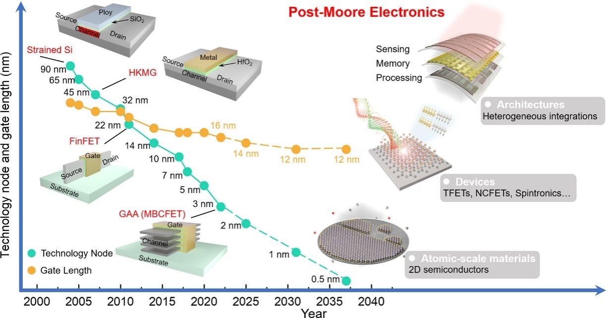 同时发表的还有一篇题为“Two-Dimensional Semiconductors and Transistors for Future Integrated Circuits”(面向未来集成电路的二维半导体和晶体管)的综述文章,聚焦面向先进制程集成电路的二维半导体及其器件工艺和集成路线。首先概述了硅基集成电路的发展和挑战,然后详细讨论了二维半导体和范德华异质结构的性质和制备策略,以及各分立器件工艺、规模化集成、新原理信息器件等方面的突破性研究进展。最后展望了二维半导体在下一代集成电路技术中的应用前景,并分析列举了从实验室向产业化过渡亟待解决的问题和可能的研究方向。我院尹蕾研究员为文章第一作者,何军教授为文章唯一通讯作者。