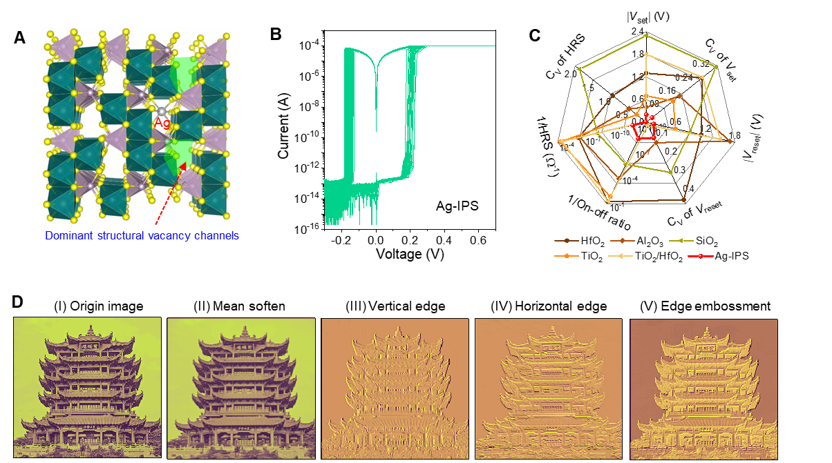 何军课题组独辟蹊径,发展了一种非缺陷驱动的忆阻器,可以解决离子型忆阻器长期存在的可变性问题,同时不会牺牲其他性能。与常见的缺陷型离子通道不同,范德瓦尔斯铟磷硫(In3/4P2S6, IPS)存在固有的周期性结构空位,天然可以提供有序的低能非缺陷型离子扩散通道。进一步利用Ag预先占据结构空位策略来限制离子扩散路径,可以在极限性能下实现极低的变异性,即在低工作电压(~0.2 V)、极高关断电阻(~1011 Ω)和极大开/关比(~108)下分别实现3.8、2.3和6.9%的低变异性。即使在0.05 V的极低工作电压下,变异性也可降至7.5%。与此同时,还可以在极低阻性层厚度(~6 nm)的情况下实现极低的工作电流(1 pA)。这种Ag掺杂结构空位的策略可以在不牺牲其他性能的情况下显著提高阻性参数一致性。基于优异的器件性能,何军课题组实现了14个基本的布尔逻辑运算和多种图像处理应用,显示出所发展的忆阻器作为高效AI硬件的潜力,为“后摩尔时代”新型高性能信息存储器件的研发提供了新材料和新方案。