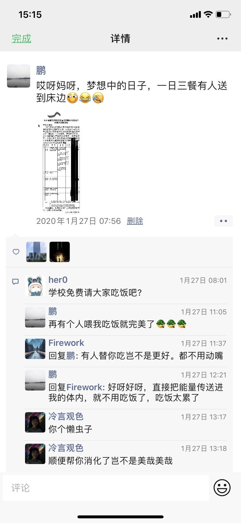 物理学院杜鹏(2018级博士,坐标枫园)开玩笑道,终于实现了梦想中一日三餐送到床边的梦想哈哈,这得益于学校在特殊时期采取的政策,为每一个留校学生提供送餐服务。