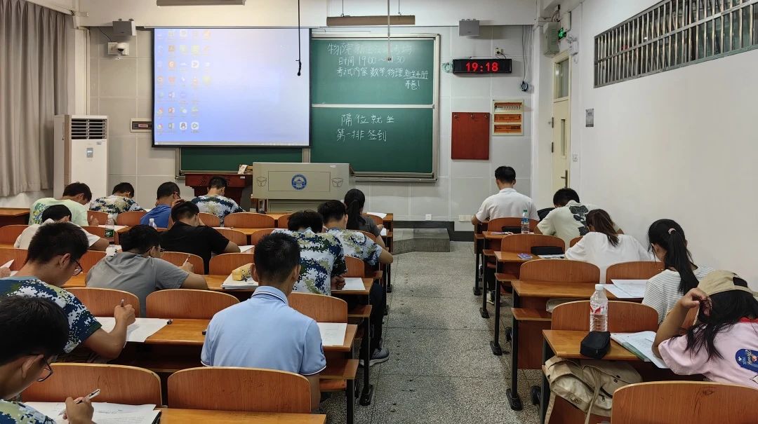 9月14日,物院新生开学测试于晚上19:00在文理学部第五教学楼207、303等4个教室正式开始。考试开始之际,同学们陆续抵达考场并落座,准备大展拳脚。铃声响起的那一刻,先前凳子的碰撞摩擦声戛然而止,取而代之的是一片沙沙的奋笔疾书声。