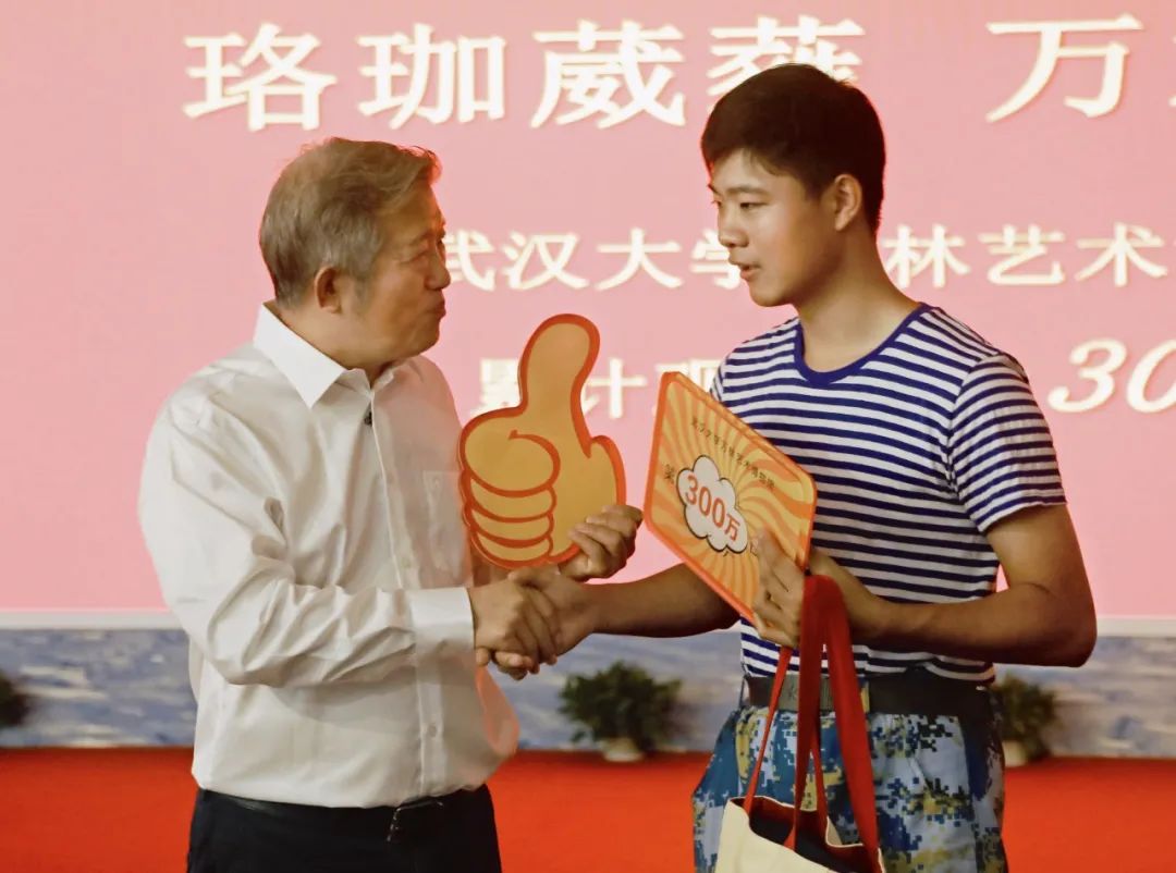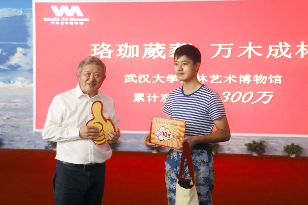 在这一历史性的时刻,第300万位幸运观众是一位物理科学与技术学院,物理学类专业刚刚入学的新生何文博,得知自己成为这一重要时刻的见证者,他激动不已,并表示:“我从小就非常喜欢博物馆,这几天趁军训之余的时间来看看展览,没想到能够成为万林艺术博物馆第三百万位观众,我感到非常荣幸和激动。这不仅是我个人的荣耀,也是对武汉大学新生的一份特殊礼物。”陈东升先生亲自为他颁发了纪念品,并作为杰出校友,对新生表达了鼓励和期望,希望他们能够在武汉大学这片沃土上茁壮成长,成为国家的栋梁之才。