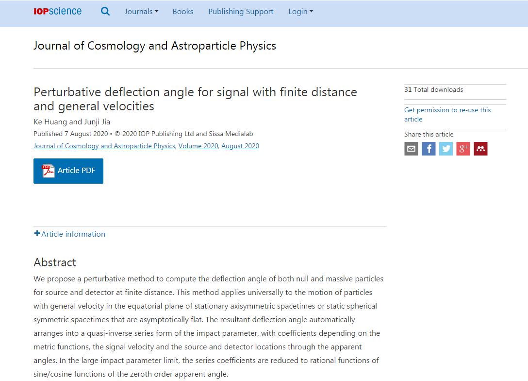 另一篇论文题名为: Perturbative deflection angle for signal with finite distance and general velocities,发表在 Journal of Cosmology and Astroparticle Physics之上。此论文提出一种计算观察者和信号源都在有限距离时的偏折角的微扰计算方法。这种方法可适用于在一般的静态轴对称时空的赤道面上或静态球对称时空中的有质量粒子和无质量粒子。黄可同学在研究过程中发现在有限距离的情况下,以前的微扰法失效, 所以他提出了一种新的方法。原创的新思路是黄可同学研究过程中的兴趣点,也是让他享受科研的重要原因。