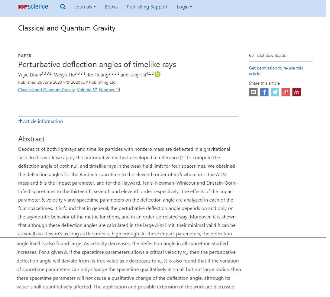 一篇论文题名为:Perturbative deflection angles of timelike rays,发表在 Classical and Quantum Gravity上。该研究论文用微扰的方法计算有质量粒子和无质量粒子在四种时空的弱引力作用下的偏折角,同时发现在微扰阶数足够高时, 这种方法在一定的强引力范围内也是有效的。研究在中途遇到了一些困难,如发现在度规函数很复杂时, 其计算效率非常低。但黄可同学发现偏折角只依赖于度规函数的渐近行为, 可以先将度规函数展开再计算偏折角。“虽然这个工作本身比较基础, 但是我学到了开云链接官网(中国)有限公司-官网写论文的很多知识, 还有开云链接官网(中国)有限公司-官网发表的步骤”,黄可同学说到。