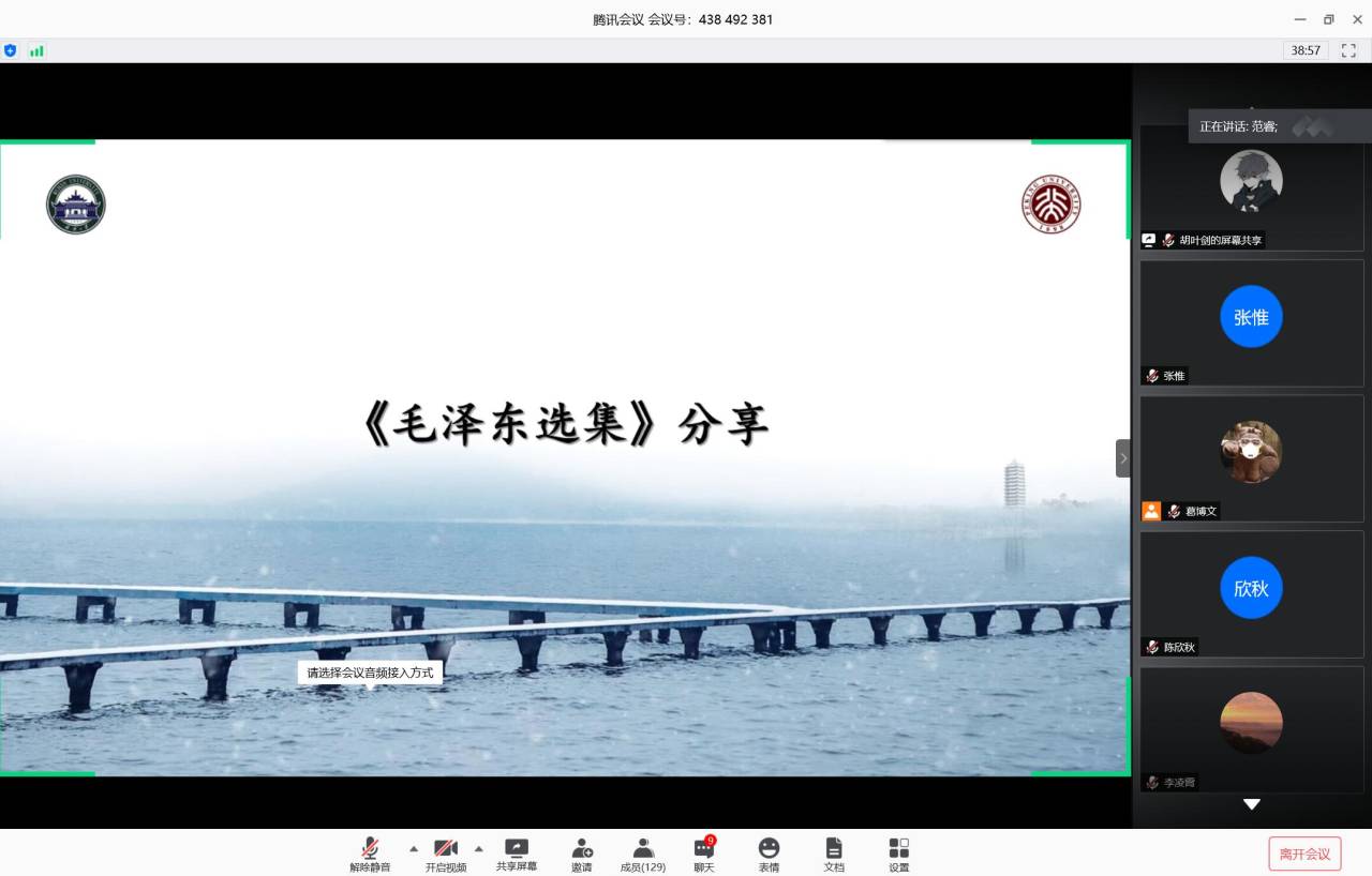 此次活动以腾讯会议为平台,来自武汉大学的周庆、单梓扬、范睿、王伟舟以及来自北京大学的杜泽宇、高逸辰等8位优秀的同学分别就自己阅读《毛泽东选集》及《邓小平时代》的感悟结合当下疫情做了分享。同时,北京大学物理学院党委副书记董晓华老师、专职辅导员王婧老师以及来自开云链接官网(中国)有限公司-官网的团委书记卢丽珠老师以及弘毅学堂学生工作办公室主任程晓婷老师应邀参与此次活动。开云链接官网(中国)有限公司-官网余晴主持此次读书会。