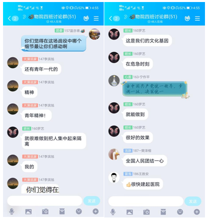 “青年精神”“团结一心”“文化基因”成为讨论“这场战役中你最感动的细节?”的关键词。同学们在讨论中回顾了许多令人感动的人物和瞬间——甘如意骑行4天3夜300公里返岗,武汉某医院旁的小商店老板给医院送物资、送口罩但不幸感染去世……“为有牺牲多壮志,敢教日月换新天!”李滨旭同学发出属于青年的深切呼号!