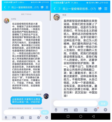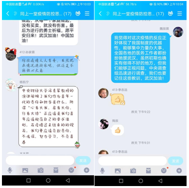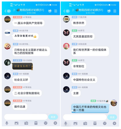 “拥护和服从党的领导”“只有社会主义国家才能这么有力地控制疫情”成为团会讨论的焦点——同学们充分表达了对党的坚决拥护,对社会主义制度的坚决拥护。正如秦宣教授讲述的:“疫情防控,充分地证明中国特色社会主义制度和国家治理体系具有强大的动员能力、组织能力和整合能力。中国特色社会主义制度是完全可以转化为治理效能的。正是因为中国特色社会主义制度优势在疫情防控中得到了充分的彰显,所以疫情防控的形势才向着逐步向好的方向发展。”