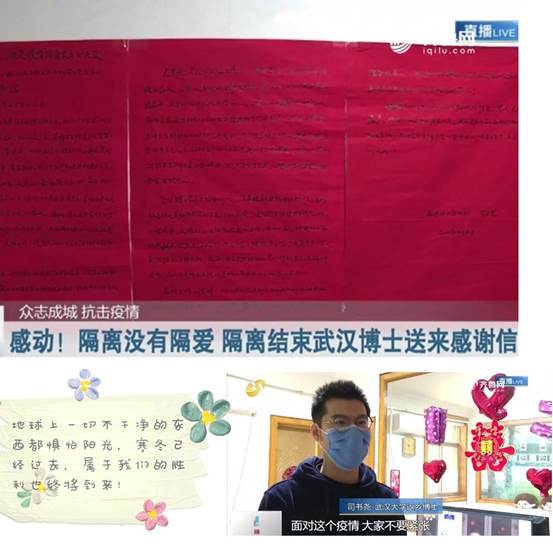 五湖四海,携手抗疫。自新冠疫情爆发以来,作为武汉返乡人员,返乡后,大家都认真做好自我隔离,配合防疫部门做好医学观察。崔兴霞同志向我们分享了自己在美国的经历,采用国内抗疫经验,勤洗手,戴口罩,囤积食物减少外出。美国领馆给留学生发放防疫物资“健康包”,学院领导老师时时关注境外学生的生活情况,及时发送疫情防控和疫情诊疗等信息。她向祖国和学院的关心帮助深表感谢。来自山东的司书尧同志向大家分享了他在家乡的经历,从武汉返乡后他不慎发烧,医务人员在他低烧时不惧风险,24小时值守,村委会也每天送去蔬菜等生活用品。隔离病毒,隔不开家乡的爱,解除隔离以后,他向家长卫生院送去了手写一封感谢信,他的事迹也被当地媒体采访并报道。娄灿灿同志讲述自己在二月中旬时参加的一个关爱医护人员子女的活动,她和其他志愿者们一起辅导小孩功课以及关注小孩的心理健康,在后方为抗疫防疫工作做贡献。