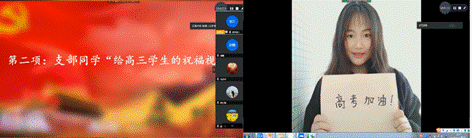 接着,会议中播放了支部同学结合疫情及自身专业的特点给高三学生做的祝福视频。疫情期间,学生在家开展线上教学,而且高考也延期举行,很多学生的学习效率、心理状态都会受到影响。因此,支部同学希望通过这个视频为高三学生加油打气,鼓励他们在冲刺阶段保持良好的状态!