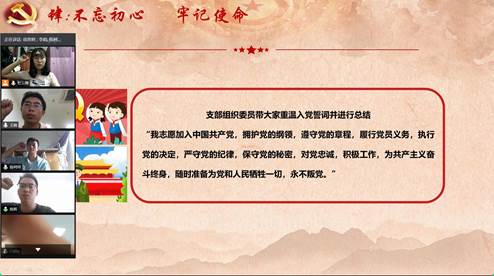 最后支部组织委员李娟带大家重温入党誓词并做了最后的总结。平安在家,努力学习,不惧疫情,勇于担当。学好本领,为我中华。虽然疫情还未结束,但最美的春天仍在绽放,待到疫去花繁,再与你共坠繁华赏风雅!希望大家齐心协力,坚决打赢这场疫情防控阻击战,早日回“珈”。
