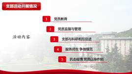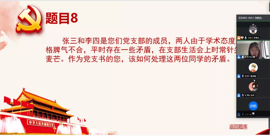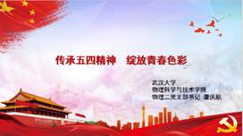 物理二支部在风采展示环节,通过丰富多彩的支部活动,从多个方面展示了模范支部应有的姿态。党员教育形式多样、党内监督严格有序、科研学习积极交流、支部成员争做模范、战疫有我以身作则……精彩的展示得到了在线师生的一致好评。紧接着,物理二支部书记唐庆航给大家讲了主题为“传承五四精神 绽放青春色彩”的微党课,从“五四精神”的现代解读到疫情下的青年榜样,每一张幻灯片都让大家感受到了青春奋斗的朴实真理——“青春由磨砺而出彩,人生因奋斗而升华”。