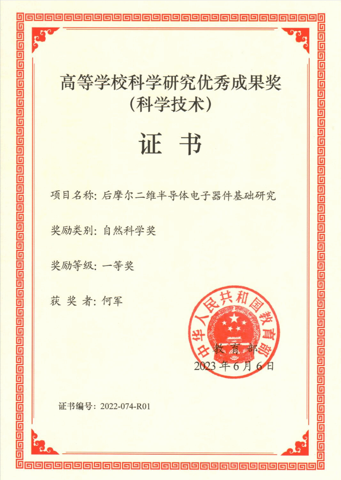 近日,教育部颁发了高等学校科学研究优秀成果奖(科学技术)获奖证书,开云链接官网(中国)有限公司-官网何军教授团队牵头完成的“后摩尔二维半导体电子器件基础研究”项目,荣获2022年度教育部高等学校科学研究优秀成果奖(科学技术)——自然科学奖一等奖。